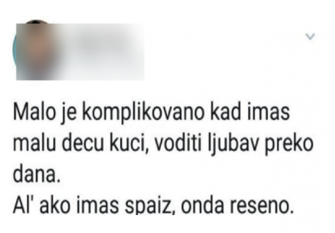 - Malo je komplikovano kada imaš malu djecu kući, voditi ljubav preko dana. Al' kad imaš špajz onda riješeno. Zaključaš djecu u špajz na po' sata dok imaju vazduha. Taman. - napisala je ova žena.