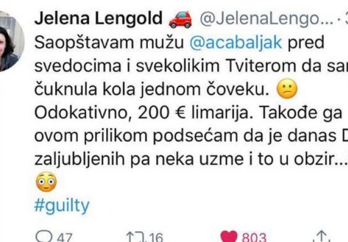 - Saopštavam mužu Aleksandru Baljaku pred svjedocima i svekolikim Tviterom da sam čuknula kola jednom čovejku. Odokativno, 200 eura limarija. Takođe ga ovom prilikom podsjećam da je danas Dan zaljubljenih pa neka uzme i to u obzir - napisala je ona uz dodala da je kriva.