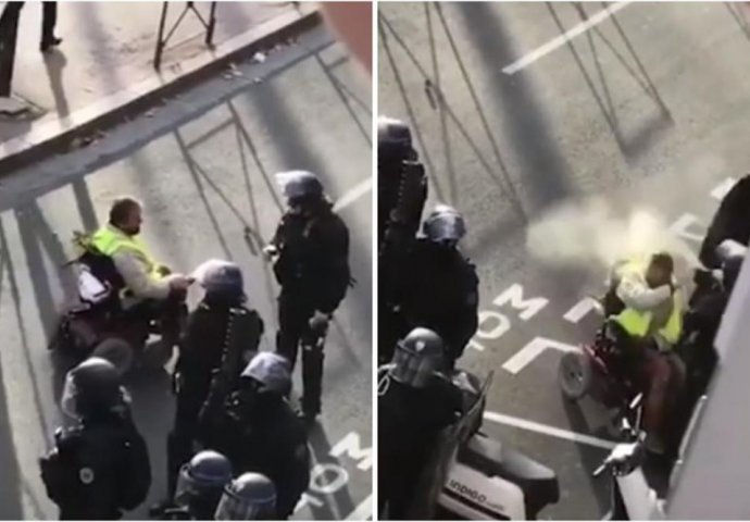 Na video snimku koji se deli na društvenim mrežama, izgleda kao da muškarac u invalidskim kolicima, koji ima na sebi žuti prsluk, prati policajca koji se iznenada okreće i prska suzavcem u pravcu lica ovog čovjeka, prenosi AP.