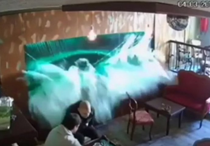 Kako se može vidjeti na snimku, veliki akvarijum koji je postavljen u renoviranom kafiću pukao je iznenada i prekinuo druženje mladića, piše "CDM".