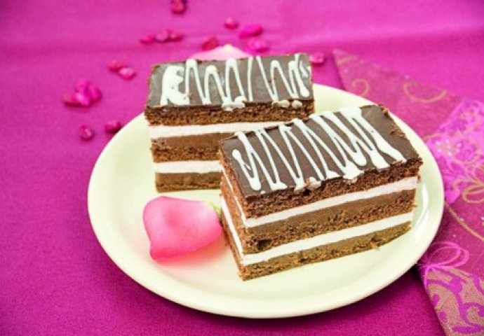 3. Čokoladu otopiti na pari i preliti preko kolača. Staviti u frižider da se stegne, a zatim kolač isjeći na kocke.