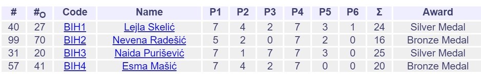 Ekipno su osvojili 9. mjesto u zvaničnoj konkurenciji od 36 zemalja i 12. mjesto od ukupno 50 zemalja. U takmičenju su učestvovale Naida Purišević, Lejla Skelić, Esma Mašić i Nevena Radešić.