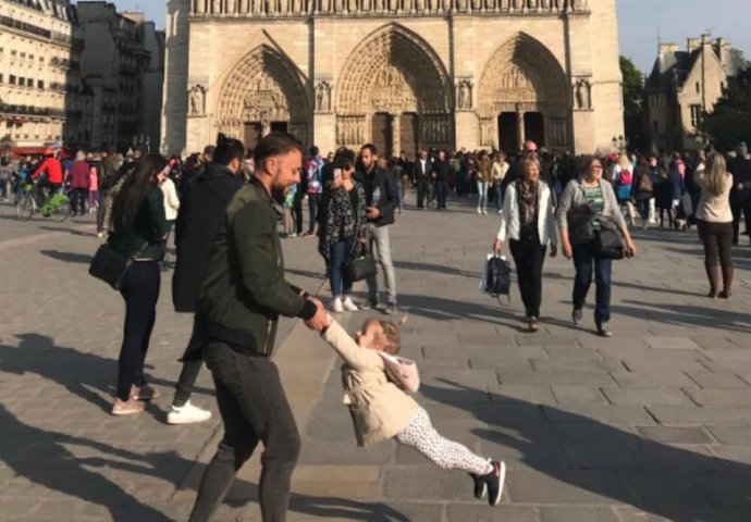 Samo sat vremena prije nego što je razorni požar zahvatio poznatu parisku katedralu otac i kćerka snimljeni su kako se veselo igraju ispred historijskog spomenika, a fotografija je od tada postala viralna.