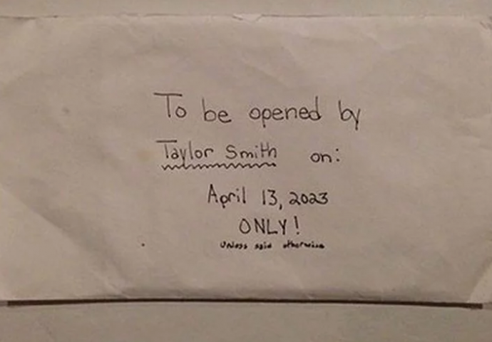 "Treba otvoriti Taylor Smith, 13. marta 2023. godine, osim ako se ne kaže drugačije", stajalo je na omotnici pisma. Nažalost, Taylor je preminula 5. januara 2014. godine, a njezini roditelji su emotivno pismo objavili online.
