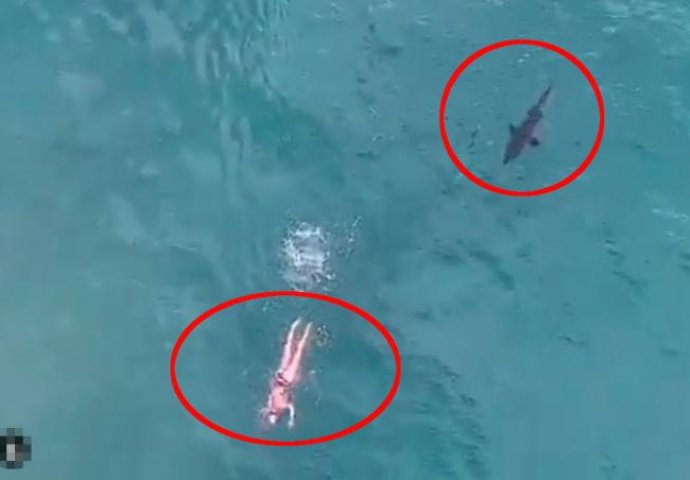 Dronom je uhvaćen uznemirujući trenutak u kojem morski pas prati plivača koji opušteno pliva.