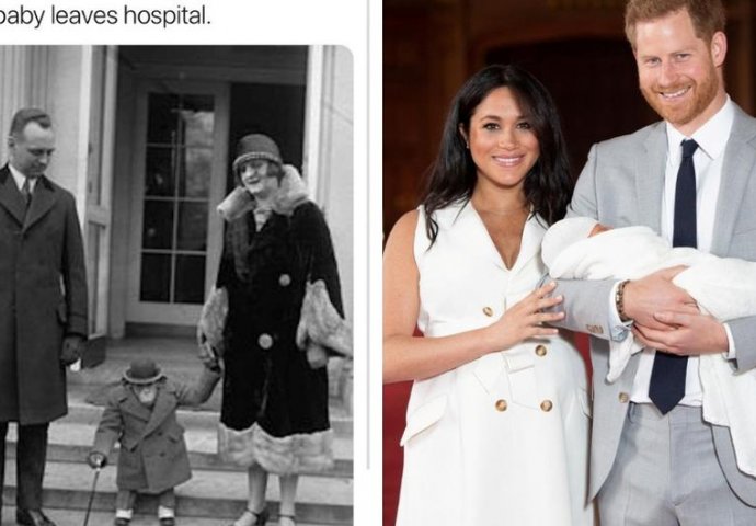 Kraljevska beba napušta bolnicu, napisao je na Twitteru Danny Baker, slavni radijski DJ ispod crno-bijele fotografije muškarca i žene koji za ruku vode čimpanzu obučenu u dječaka.
