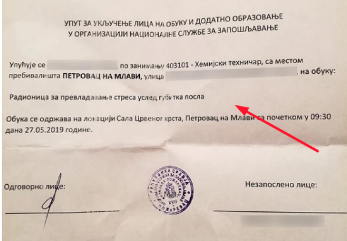 "Uput" za radionicu za prevladavanje stresa uslijed gubitka posla, dobio je od Nacionalne službe za zapošljavanje nezaposleni meštinin Petrovca na Mlavi i, sudeći prema svojim komentarima na ovakav dopis, očigledno je razočaran što se u koverti nije nalazila ponuda za neki novi posao.
