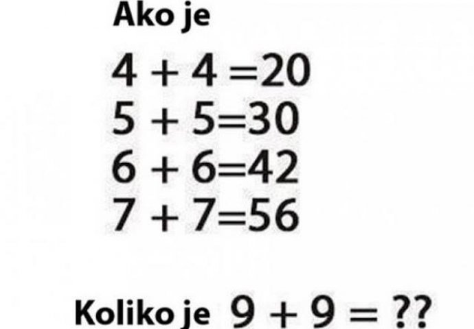 SAMO 10 POSTO LJUDI MOŽE RIJEŠITI OVU MOZGALICU: Jeste li među njima? Kiosk 28.05.19. 12:02 . U nastavku vam donosimo mozgalicu kako biste se zabavali, ali i provjerili svoje znanje. Ovu matematičku mozgalicu nije baš jednostavno riješiti. Nju može da riješi samo 10 posto ljudi. Provjerite jeste li među njima. Koji je tačan odgovor?