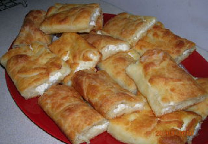 2.Tijesto ostaviti da nadođe. Na površinu posutu brašnom tijesto podijeliti i razvući.Svaki razvučeni dio premazati otopljenim margarinom.