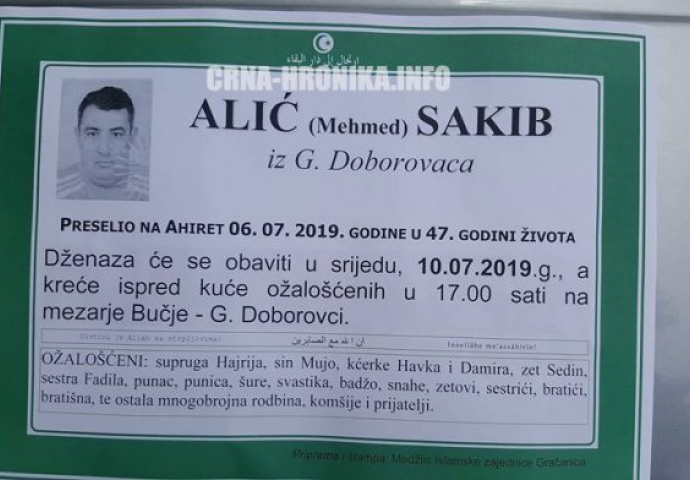 Dženaza tragično preminulom Sakibu Aliću će se održati u srijedu u mjestu G. Doborovci na mezarju Bučje u 17 sati.