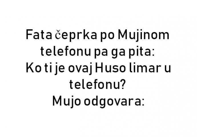 VIC : Fata čeprka Mujin telefon Kiosk 15.07.19. 13:29 . Fata čeprka po Mujinom telefonu pa ga pita: Ko ti je ovaj Huso limar u telefonu? Mujo odgovara: