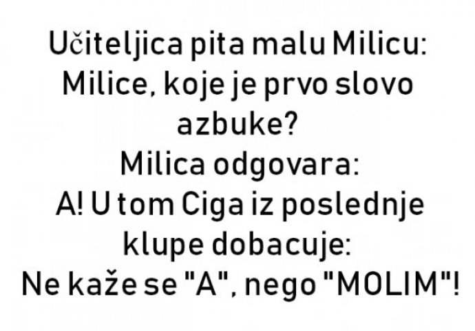 VIC : Prvo slovo AZBUKE Kiosk 17.07.19. 10:39 . Učiteljica pita malu Milicu: Milice, koje je prvo slovo azbuke? Milica odgovara: A! U tom Ciga iz poslednje klupe dobacuje: Za još smijeha, pročitajte još urnebesnih viceva na sljedećoj stranici --->>>
