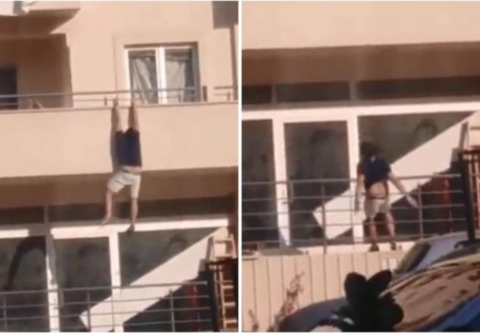 Naime, na snimku se vidi kako jedan momak visi sa ograde na terasi stana.