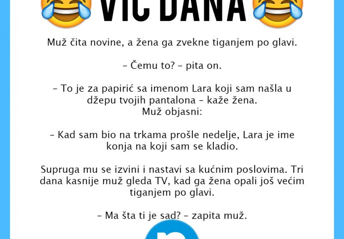 Supruga mu se izvini i nastavi sa kućnim poslovima. Tri dana kasnije muž gleda TV, kad ga žena opali još većim tiganjem po glavi.