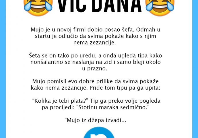 Mujo je u novoj firmi dobio posao šefa. Odmah u startu je odlučio da svima pokaže kako s njim nema zezancije. Šeta se on tako po uredu, a onda ugleda tipa kako nonšalantno se naslanja na zid i samo bleji okolo u prazno. Mujo pomisli evo dobre prilike da svima pokaže kako nema zezancije. Priđe tom tipu pa ga upita: “Kolika je tebi plata?” Tip ga preko volje pogleda pa procijedi: “Stotinu maraka sedmično.”