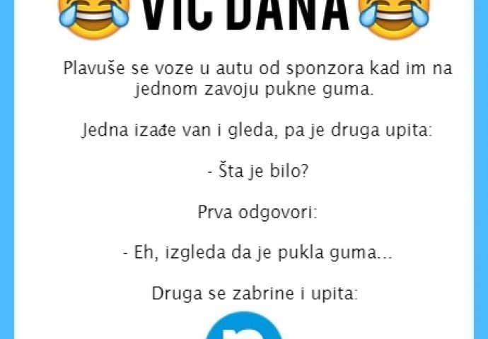 Plavuše se voze u autu od sponzora kad im na jednom zavoju pukne guma. Jedna izađe van i gleda, pa je druga upita: