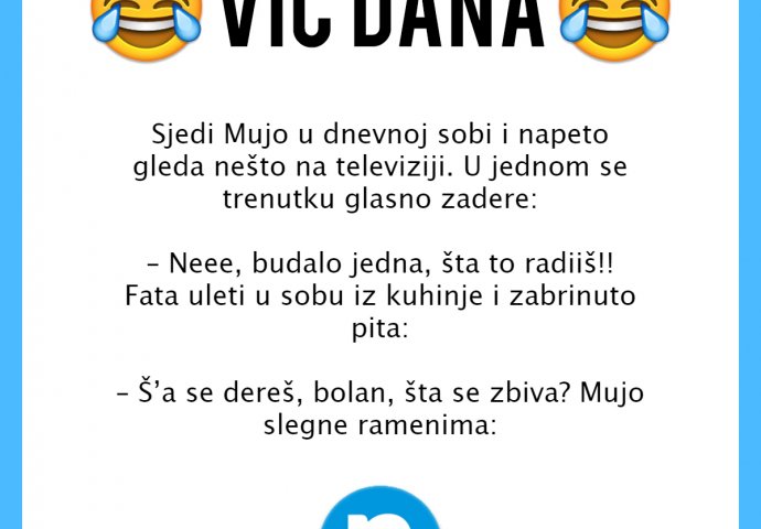 Sjedi Mujo u dnevnoj sobi i napeto gleda nešto na televiziji. U jednom se trenutku glasno zadere: