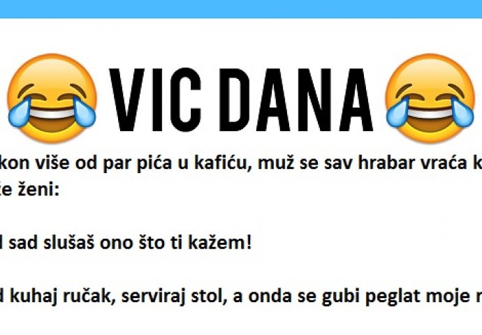 Nakon više od par pića u kafiću, muž se sav hrabar vraća kući i kaže ženi: 'Od sad slušaš ono što ti kažem! Sad kuhaj ručak, serviraj stol, a onda se gubi peglat moje rublje. Večeras idem van, a ti ćeš pozavršavat poslove po kući. I još jedna stvar - pogodi tko će mi od sada prati noge i brijati me!'