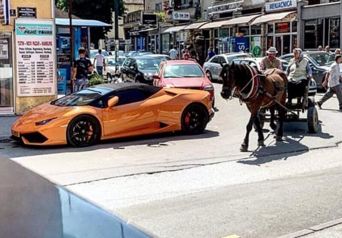 Fotografija jednog takvog prizora objavljena je na društvenim mrežama, a na njoj se vidi konjska zaprega i parkiran Lamborgini Hurakan, vrijedan preko 200.000 evra.