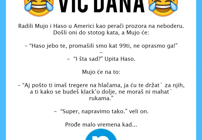 Radili Mujo i Haso u Americi kao perači prozora na neboderu. Došli oni do stotog kata, a Mujo će: