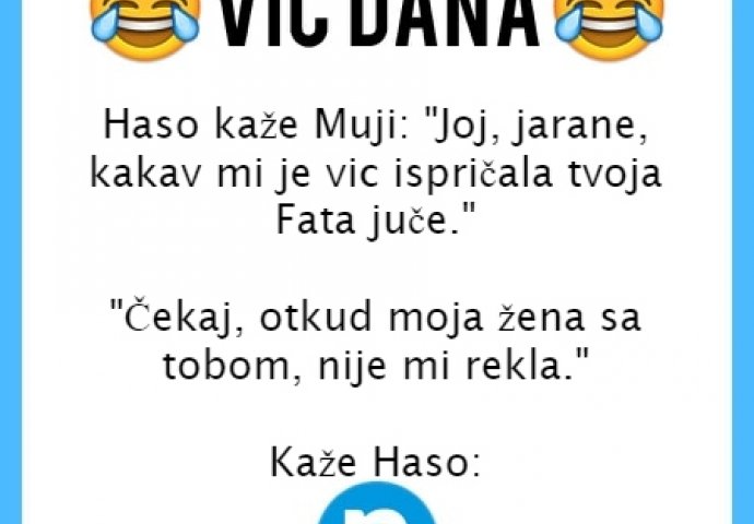 Haso kaže Muji: "Joj, jarane, kakav mi je vic ispričala tvoja Fata juče."