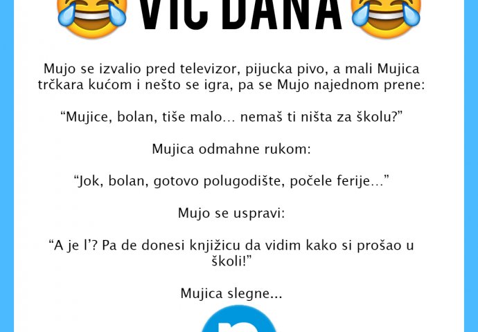 Mujo se izvalio pred televizor, pijucka pivo, a mali Mujica trčkara kućom i nešto se igra, pa se Mujo najednom prene: