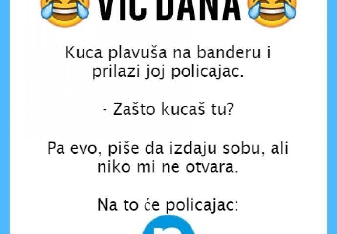 VIC DANA: Plavuša i policajac Kiosk 04.09.19. 16:08 . Kuca plavuša na banderu i prilazi joj policajac. - Zašto kucaš tu? Pa evo, piše da izdaju sobu, ali niko mi ne otvara. Na to će policajac: - Čudno da nema nikoga, a gori im svjetlo.