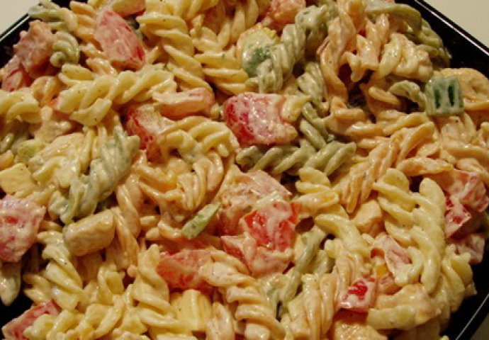 Tjesteninu skuhajte u slanoj vodi, a povrće narežite na kockice. Još toplo meso i tjesteninu pomiješajte, dodajte povrće. Umiješajte sve sastojke za dressing, dobro promiješajte dok ne dobijete gladak umak, umiješajte začine (bosiljak, origano, sol, papar) i prelijte po salati, sve dobro promiješajte, te ostavite da odstoji u frižideru 1 sat.