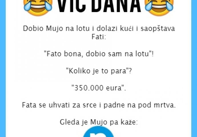 VIC DANA: Mujo dobio na lotu Kiosk 07.09.19. 18:22 . Dobio Mujo na lotu i dolazi kući i saopštava Fati: "Fato bona, dobio sam na lotu"! "Koliko je to para"? "350.000 evra". Fata se uhvati za srce i padne na pod mr,tva. Gleda je Mujo pa kaže: "Kad te hoće, stvarno te hoće".