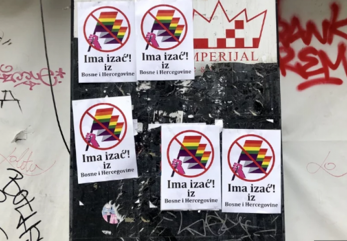 Jutros su u centru Sarajeva osvanuli plakati koji nose poruku protiv povorke gdje je logo s porukom "Ima izać'" prekrižen crvenim linijama.