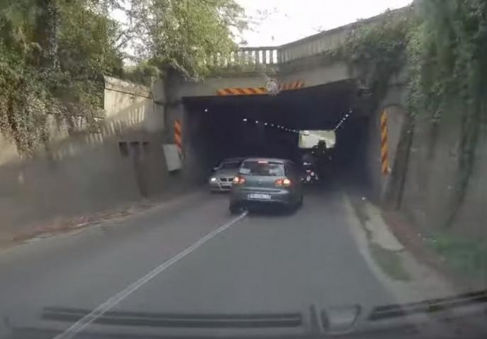 Na snimku je zabeležen trenutak kako vozač na skretanju ispred podvožnjaka pretiče preko pune linije jedno vozilo, a onda je pokušao da pretekne i motociklistu.