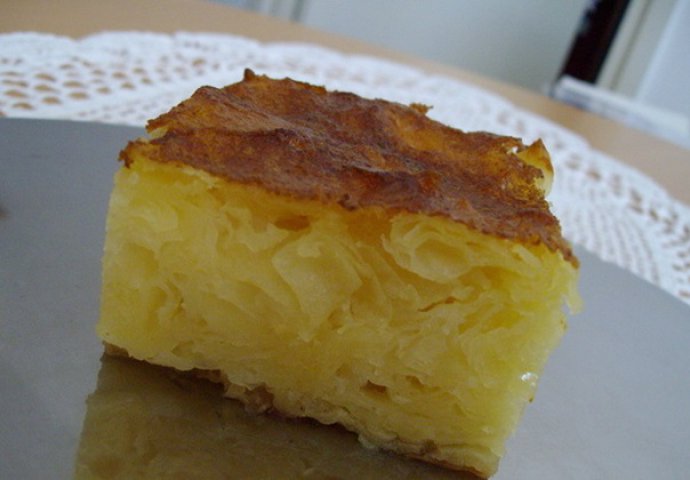 Izmiješajte smjesu sa istrganim listovima. Ulijte u namazanu i brašnom posutu tepsiju 20×30 i pecite na 150 stupnjeva (ventilator) oko 30 min. U međuvremenu prokuhajte vodu sa šećerom i limunom i ostavite da se ohladi. Pečeni kolač prelijte sa sirupom.