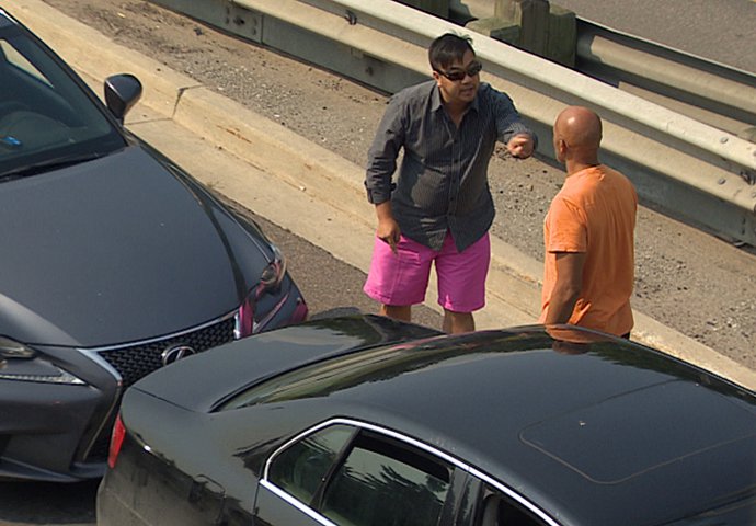 Dok je davao izjavu za jednu televiziju, ispod nadvožnjaka na kojem je stajao dogodio se sudar. Krenula je svađa i tuča vozača.