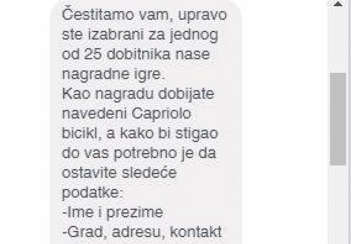 Nagradna igra sastoji se u tome da je na lažnoj Facebook stranici 20. 9. 2019. godine objavljena nagradna igra u kojoj "Capriolo" poklanja 25 "Capriolo" bicikala, te je za učestvovanje potrebno lajkovati stranicu, podijeliti objavu na vlastitom profilu i u inboksu navesti broj od 1 do 500.