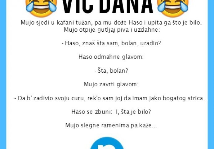 Mujo sjedi u kafani tužan, pa mu dođe Haso i upita ga što je bilo. Mujo otpije gutljaj piva i uzdahne: