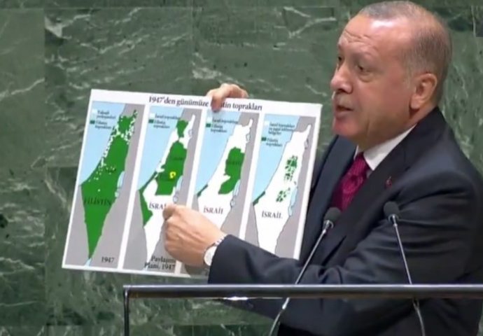 Nakon toga je je izvukao mapu Palestine pokazavši jasno kako je Izrael proteklih decenija otimao ovu zemlju. Erdogan je na vrlo slikovit način upitao članice UN-a da mu pokažu gdje je Izrael bio 1947. godine i gdje je zapravo danas.