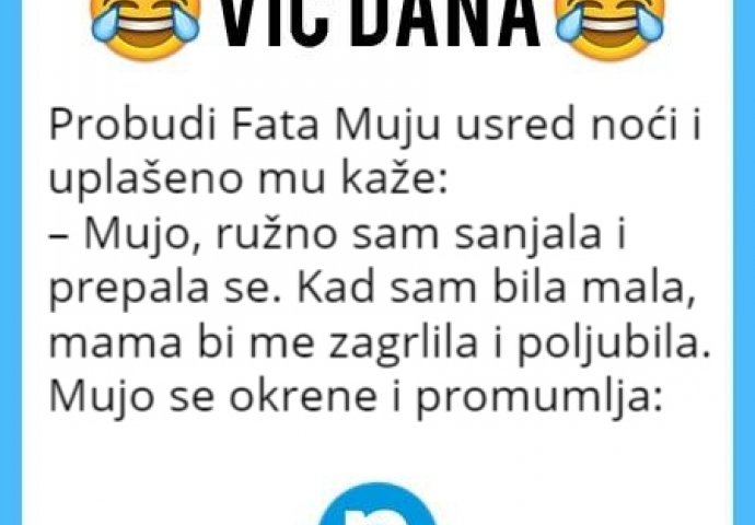 VIC DANA: Probudi Fata Muju usred noći Kiosk 12.10.19. 12:54 . Probudi Fata Muju usred noći i uplašeno mu kaže: – Mujo, ružno sam sanjala i prepala se. Kad sam bila mala, mama bi me zagrlila i poljubila. Mujo se okrene i promumlja: – Ma, jesi poludjela, pa neću te valjda sad voziti kod majke! Novi.ba