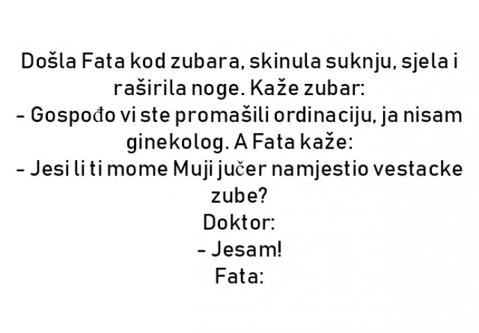 Došla Fata kod zubara, skinula suknju, sjela i raširila noge. Kaže zubar: