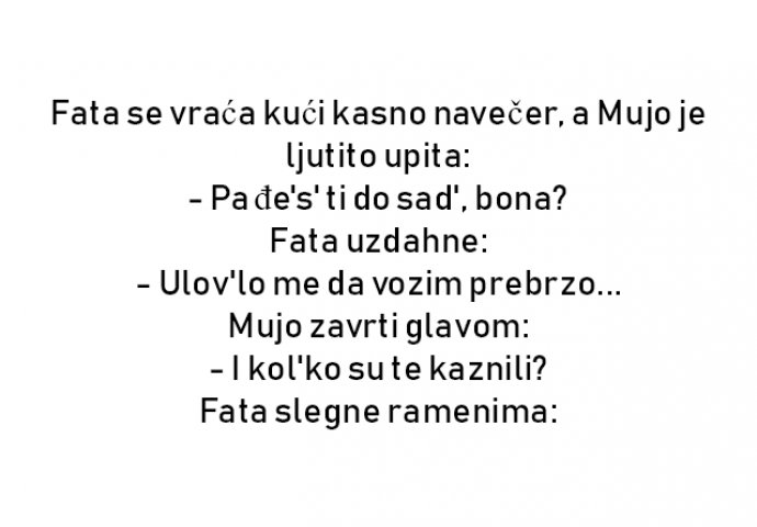 VIC DANA: Fata se kući vraća kasno navečer Kiosk 07.11.19. 08:03 - Fata se vraća kući kasno navečer, a Mujo je ljutito upita: - Pa đe's' ti do sad', bona? Fata uzdahne: - Ulov'lo me da vozim prebrzo... Mujo zavrti glavom: - I kol'ko su te kaznili? Fata slegne ramenima: BONUS VICEVI: