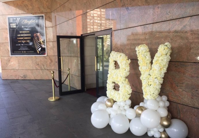 Na samom ulazu nalazi se dekoracija od bijelog cvijeća, sa balonima, od kojeg su napravljeni inicijali imena mladenaca.