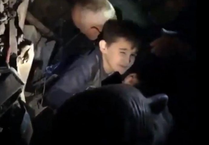 Donji dio tijela djeteta ostao je pod ruševinama, pa spasioci pokušavaju da mu pomognu, prenosi Blic.