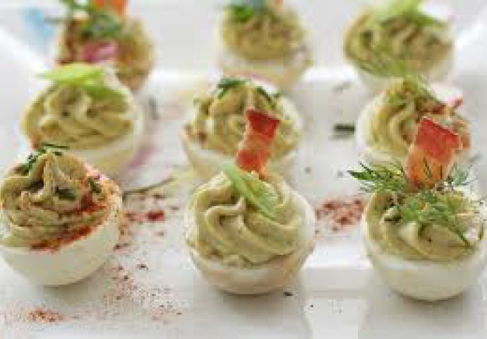 Izmrvljene inčune i kapare povežemo sa zgniječenim žumanjcima žlicom majoneze i time punimo jaja.
