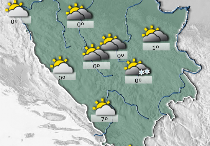 Sutra u Bosni i Hercegovini oblačno. Prije podne na području Hercegovine slaba kiša. U poslijepodnevnim i večernjim satima padavine širom zemlje. U nizinama većinom kiša ili susnježica, u višim područjima slab snijeg. Vjetar slab, većinom južnog i jugoistočnog smjera. Na sjeveru zemlje vjetar sjevernog smjera. Najniža jutarnja temperatura zraka uglavnom između -4 i 1°C, na jugu zemlje od 3 do 7°C. Najviša dnevna temperatura zraka uglavnom između 1 i 5°C, na jugu zemlje od 7 do 11°C.