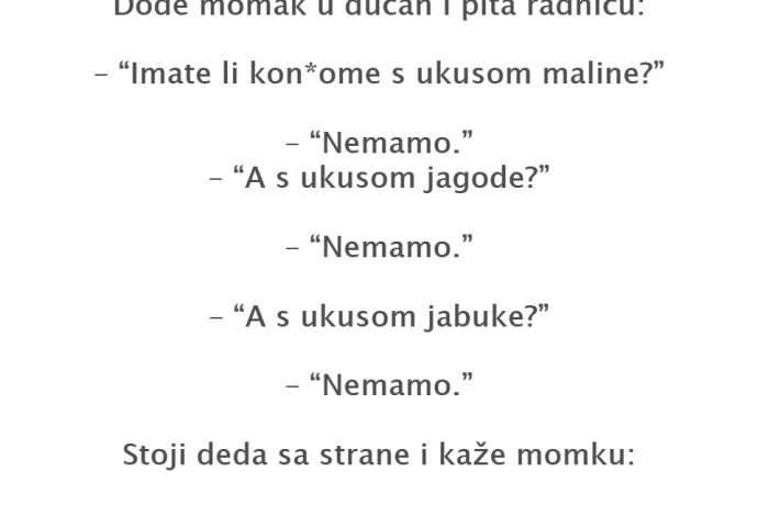VIC DANA: DOĐE MOMAK U DUĆAN Kiosk 23.12.19. 12:10 . Dođe momak u dućan i pita radnicu: – “Imate li kondome s ukusom maline?” – “Nemamo.” – “A s ukusom jagode?” – “Nemamo.” – “A s ukusom jabuke?” – “Nemamo.” Stoji deda sa strane i kaže momku: - Mali, oŠ ti kompot praviti ili...