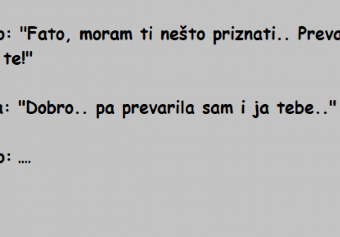 VIC: Mujo prevario Fatu Kiosk 25.12.19. 11:52 . Mujo: "Fato, moram ti nešto priznati.. Prevario sam te!" Fata: "Dobro.. pa prevarila sam i ja tebe.." Mujo: "1. APRIL.." Fata: "26. februar" BONUS VICEVI: