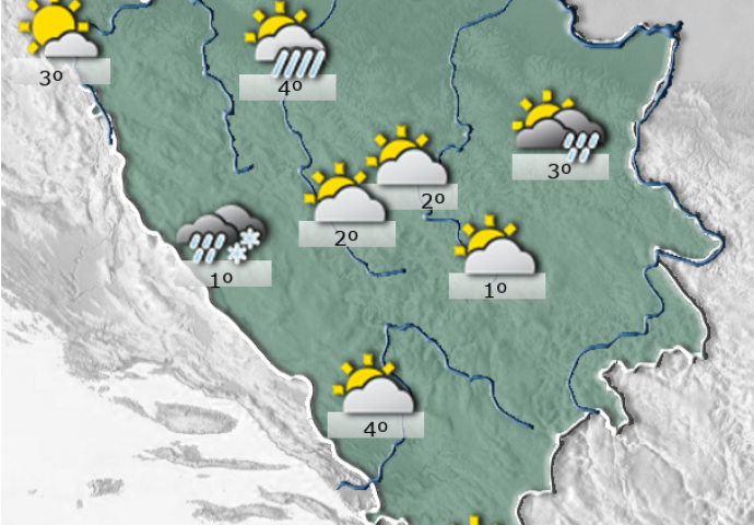 Sutra se u Bosni očekuje pretežno oblačno vrijeme. Nešto manje oblačnosti očekuje se na sjeveru. U Hercegovni malo do umjereno oblačno i sunčano. U jutarnjim satima i dio prijepodneva uglavnom u Bosni bez padavina. Tokom dana u centralnim i istočnim područjima Bosne sa kišom i susnježicom u nizinama, a u višim područjima sa snijegom. Vjetar u Bosni slab do umjeren sjevernog smjera, a u Hercegovini slaba bura. Jutarnja temperatura od -2 do 4, na jugu od 4 do 8, a najviša dnevna od 3 do 10, na jugu od 7 do 12 stupnjeva.