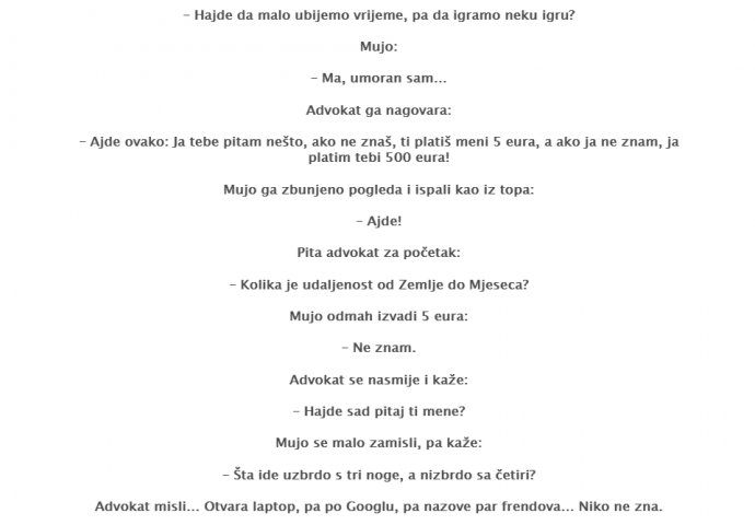 – Ajde ovako: Ja tebe pitam nešto, ako ne znaš, ti platiš meni 5 eura, a ako ja ne znam, ja platim tebi 500 eura!