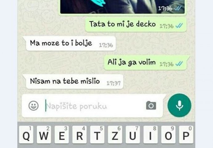 POSLALA SAM OCU SLIKU SVOG NOVOG DEČKA: Razočarao se, a onda sam saznala zašto, IMAM NAJGOREG OCA U DRŽAVI! VEĆ DVA DANA SAMO PLAČEM Kiosk 27.12.19. 12:28 . POSLALA SAM OCU SLIKU SVOG NOVOG DEČKA: Razočarao se, a onda sam saznala zašto, IMAM NAJGOREG OCA U DRŽAVI! VEĆ DVA DANA SAMO PLAČEM Pogledajte cijeli razgovor u nastavku: Tata to mi je decko Ma moze to i bolje Ali ja ga volim …