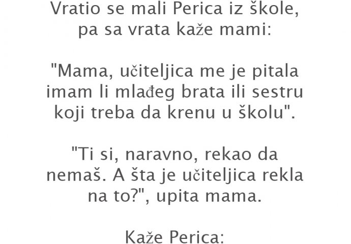 Vratio se mali Perica iz škole, pa sa vrata kaže mami: