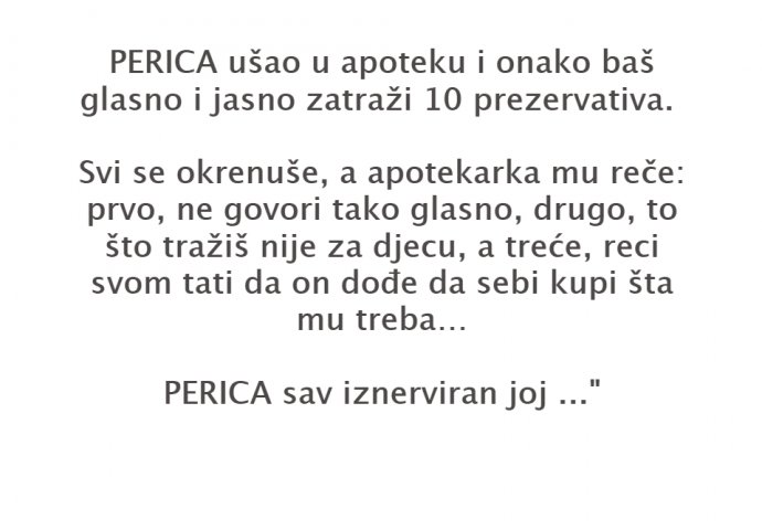 PERICA ušao u apoteku i onako baš glasno i jasno zatraži 10 prezervativa. Svi se okrenuše, a apotekarka mu reče: prvo, ne govori tako glasno, drugo, to što tražiš nije za djecu, a treće, reci svom tati da on dođe da sebi kupi šta mu treba…
